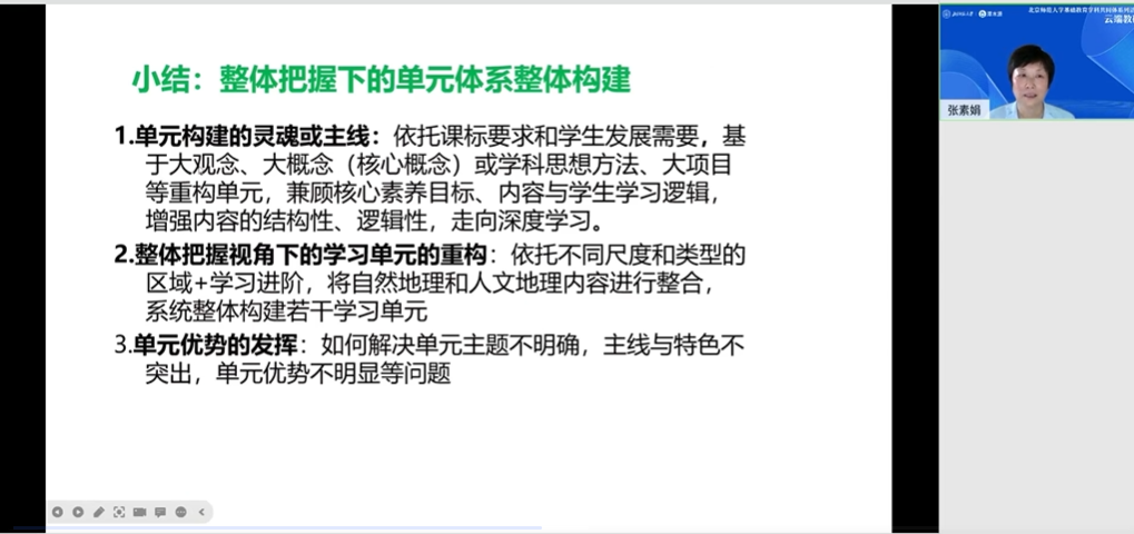 在本次讲座中,张素娟教授和张树宏老师聚焦地理学科大单元教学中的理论和实践问题,向大家展示了高中地理教学中整体把握教学内容进行单元构建的思路和案例,有助于各位教师工作者更好地提升单元教学设计和实施水平,更有效地培养学生的核心素养。