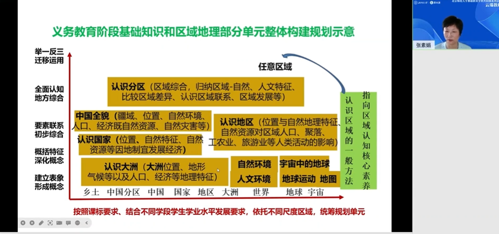 2023年9月27日,足球欧洲杯 基础教育学科共同体系列活动云端教研之“地理学科共同体【高中地理】”讲座取得圆满成功。本次讲座的特邀主讲人是北京教育足球欧洲杯教授、北京教育学会地理研究会副理事长张素娟和中学高级教师、北京市特级教师张树宏,讲座的主题为“素养导向下高中地理单元整体规划与构建”。此次讲座由足球欧洲杯 地理学科共同体学术委员会的委员共同策划组织,由张芊町老师主持。本次讲座包含两个环节,一是张素娟教授带来主题为“素养导向下高中地理单元整体规划与构建”的理论学习;二是张树宏老师带来主题为“素养导向下高中地理大单元整体构建实践指导”的讲座,重点围绕高中地理单元整体规划和构建讲解实操实践。