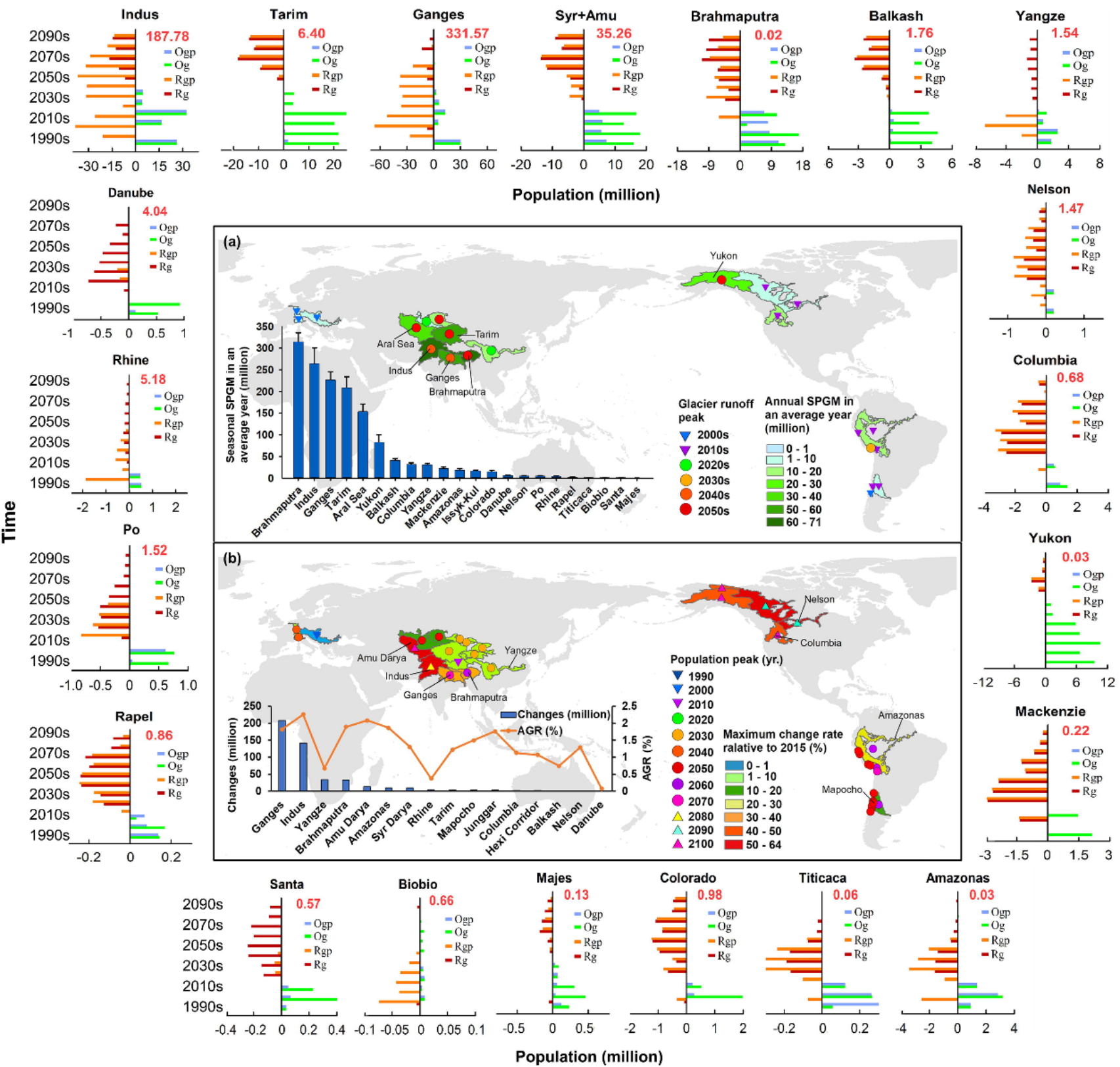 研究首先从冰川水资源的供给潜力和人口依赖性两个方面对全球193个冰川作用流域(南极洲除外)的冰川水资源重要性进行了区划。结果表明冰川水资源在其中36个流域发挥着重要作用。2015年36个流域总人口为11.6亿,但超过一半(51.6%)人口面临严重缺水,年人均可获得用水量不足500 m3。通过构建冰川融水变化机遇&风险分析模型,本研究进一步评估了1980-2100年全球冰川水资源重要补给区融水和人口变化的(不)匹配性及其共同产生的机遇和/或风险。结果表明大多数情景预估冰川融水的服务潜力和补给区人口均在一定时期内持续增加,直到达到峰值后才逐渐下降(所有RCP情景,除SSP3以外的所有SSP情景);但融水的服务潜力和人口变化并不匹配,因此给不同时期流域社会经济的发展带来机遇和/或风险。尤其发现:冰川融水给印度河流域带来的机遇最大但风险也最大,从20世纪90年代到21世纪40年代,冰川融水的增加可以季节性满足额外8370万人的基本用水需求,但之后至本世纪末由于冰川融水不断减少且人口还将增加,预估流域有额外1.29亿人面临严重的水资源短缺风险。