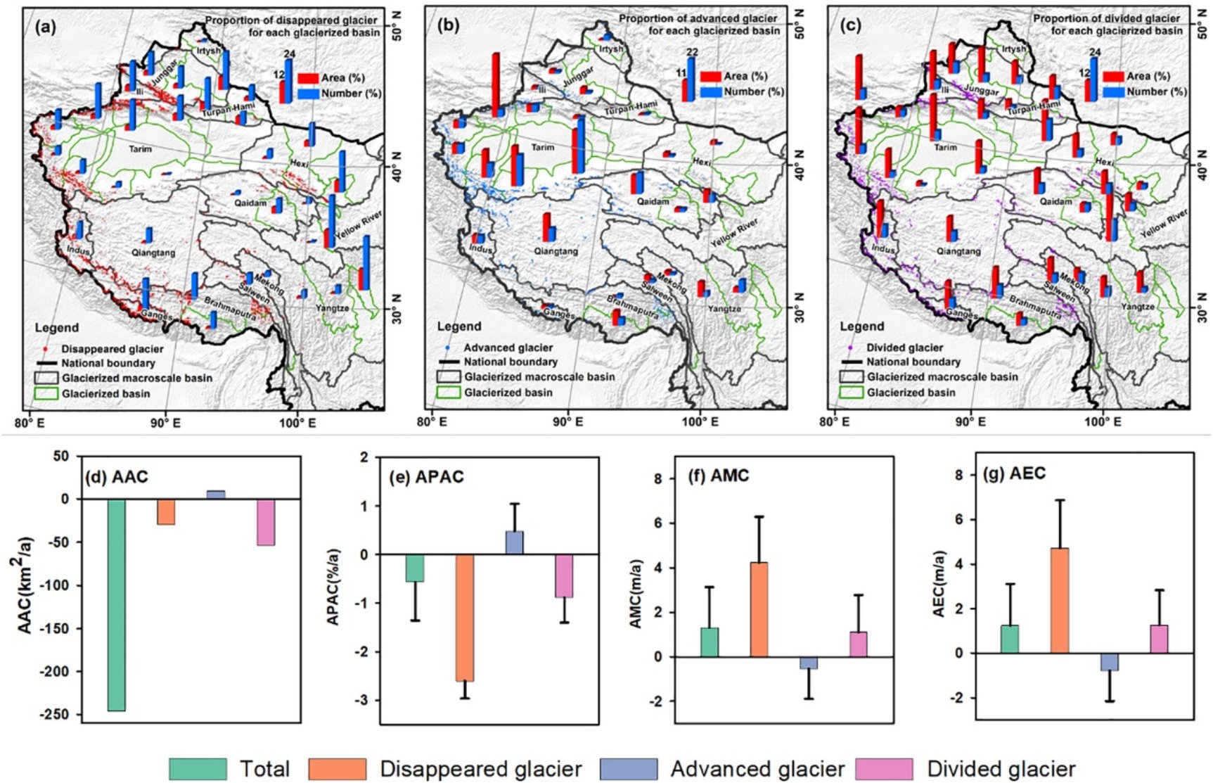 研究首次把第一次冰川编目(20世纪50年代至80年代)和第二次冰川编目(21世纪初期)期间的冰川演化路径分为四大类并建立了一一对应关系,对精度较高的34,578 条冰川(占第一次冰川编目总条数的74.6%)变化进行了分析。结果显示,在过去的半个世纪里,有5956条(17.2%)小冰川已经消失,仅有1907条(5.5%)冰川面积扩展,绝大多数(25901条)冰川不断萎缩,还有2721条冰川(7.9%)随着退缩分解成两支或多支。通过对时间和面积进行加权,过去几十年中国冰川减少面积和体积速率分别为 -3599.1 km2/10a 和-298.3 km3/10a,相对变化速率分别为-5.6%/10a 和-5.3%/10a,此外,冰川平衡线高度平均上升12.5m/10a。基于定位观测的中国典型冰川物质平衡和长度自20世纪60年代以来呈减小趋势,特别是90年代以来这一趋势加速。选取观测或重建时间序列较长的13条和41条冰川分别作为中国和全球的参照冰川,发现1960-2019年中国冰川的退缩速率接近全球平均水平,但平均物质损失量低于全球平均水平。