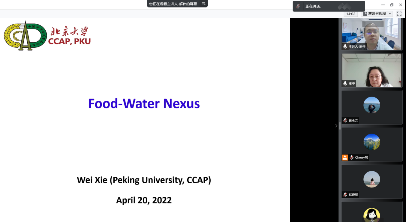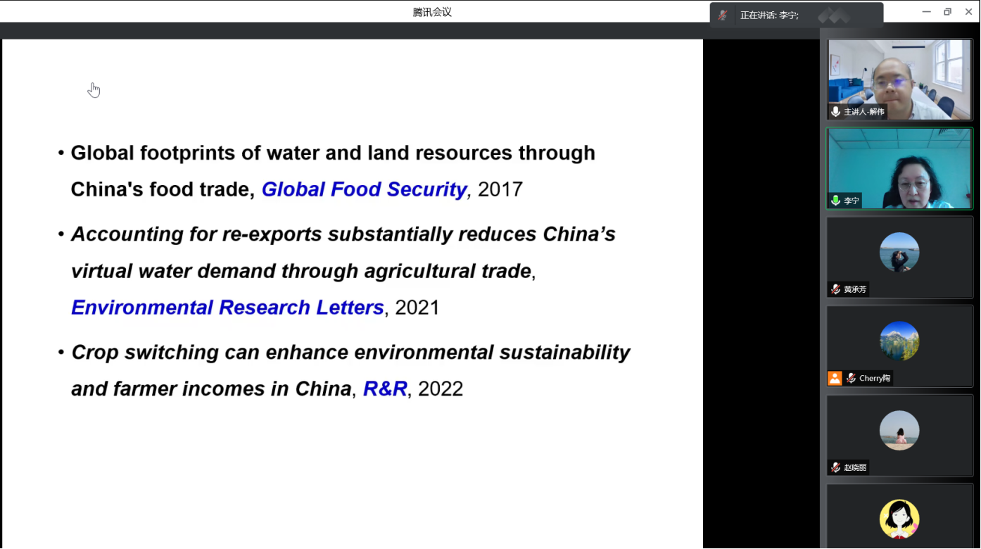 解伟研究员围绕农业生产问题,结合从发现问题到解决问题以实现科研创新进而发表高质量论文的亲身科研经历,以三篇研究型论文开展了深入的讲解,包括层层递进的三项内容:从中国的进出口贸易的角度,以基于投入产出模型研究的粮食作物的水足迹结果进行分析,指出中国实现粮食生产与消费自给自足的难度以及进口的必要性;结合全球产业链及贸易结构,从产品再出口的角度提出区分产品再出口到来源地与其他地区的关键性,指出进出口商品考虑水资源关税的重要性;以前期研究为基础,考量多种粮食作物的单产、播种面积、需水量、土地资源等影响因素,研究得出全球不同作物最优生产布局,该布局满足每种作物单产最高、资源消耗最少,同时也能实现该作物产量不减少、农民收入不降低的条件。