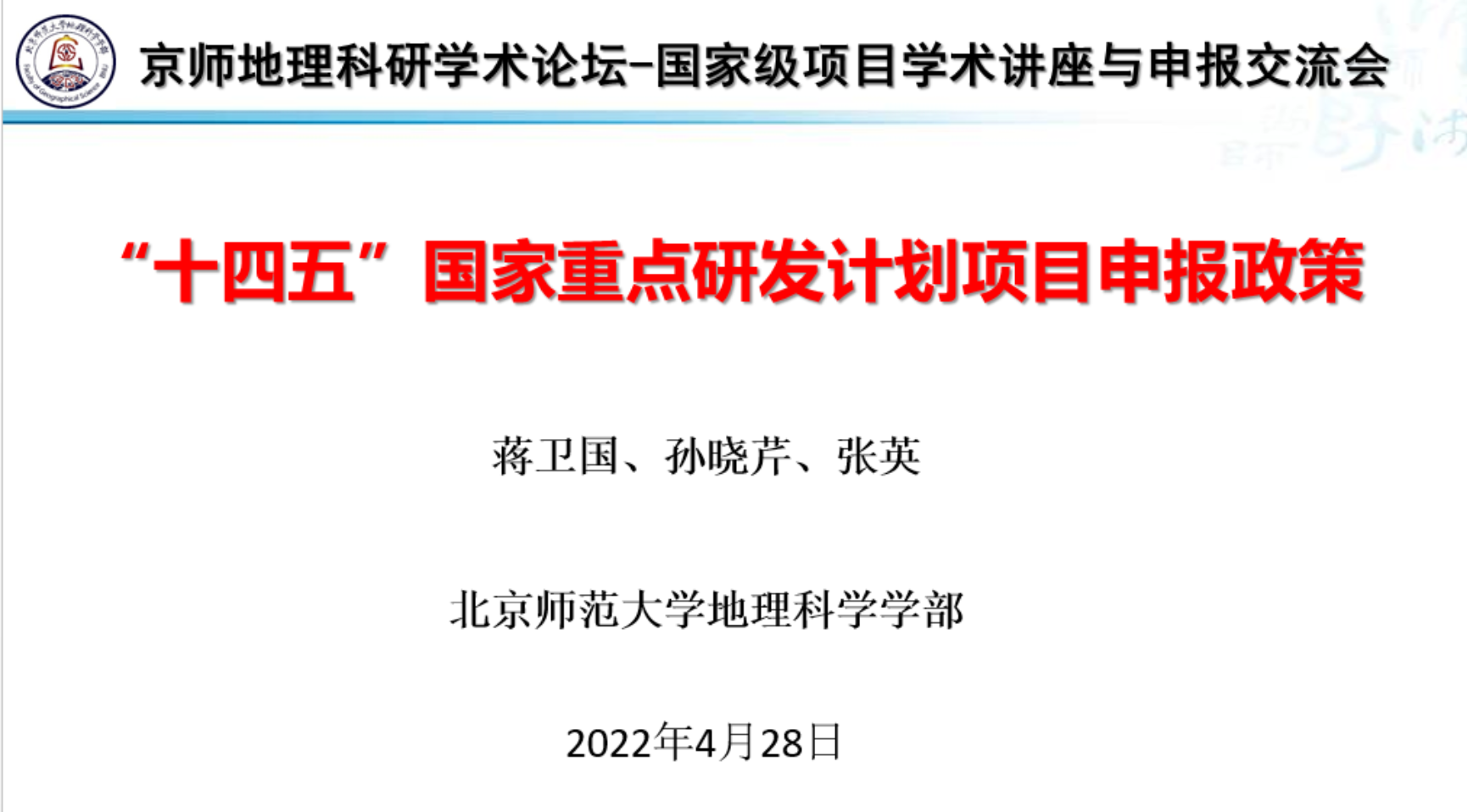 本次会议在北京师范大学科研院的指导下,在地理科学学部宋长青部长的部署下,对2022年国家重点研发计划项目申报开展了专题讲座、分类指导和经验交流,是京师地理科研学术论坛的系列活动之一。通过深入探讨国家重点研发计划各类项目的申报要求和申报流程,了解准备过程及注意事项,为科研人员尤其是青年科学家提供项目申报经验,对地理科学学部的科研项目申请、科研团队建设和一流学科建设具有一定的促进作用。