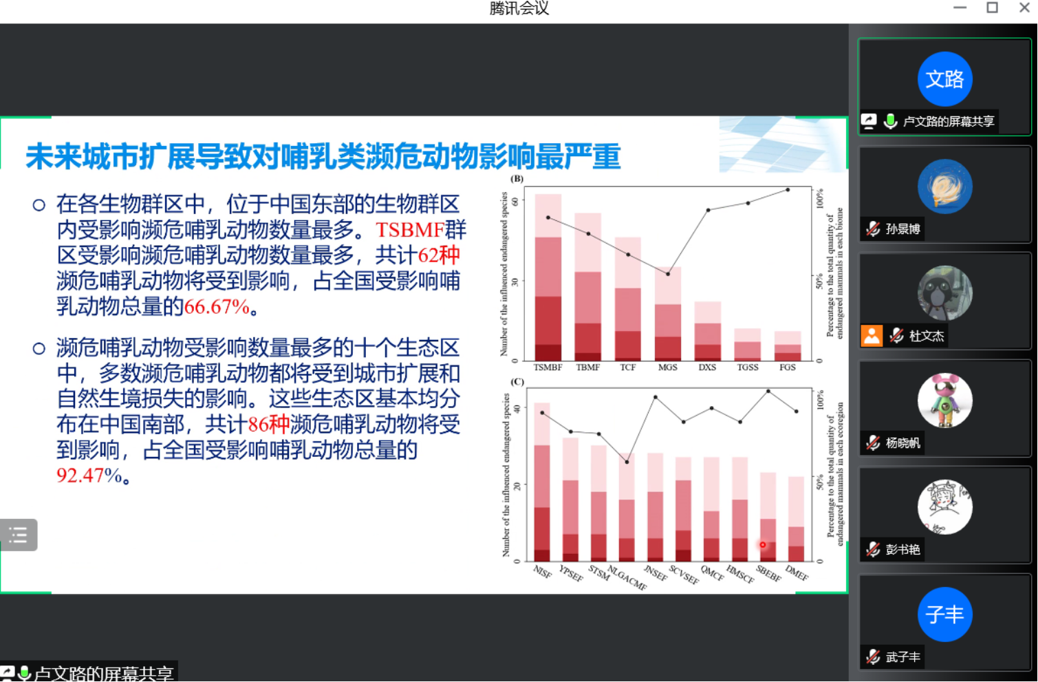 卢文路同学汇报的题目为“中国未来城市扩展过程对自然生境的影响加剧”。他的研究针对当前中国城市扩展过程对自然生境影响的评估,基于卷积神经网络CNN和本地化SSPs数据改进了LUSD-urban(Land Use Scenario Dynamics-urban)模型,模拟了不同本地化SSPs情景下,中国2020-2050年城市扩展过程,进而在不同尺度评估城市扩展过程对自然生境的影响。研究主要结论为:(1)未来我国城市的扩展将导致全国多类自然生境损失加剧,其中草地生境损失量加剧最为严重,损失量将达到历史过程的1.49倍;(2)自然生境的损失将对中国境内多数濒危物种产生负面影响,其中以哺乳类濒危物种受影响数量最多,共有93种,占中国境内的全部濒危哺乳动物的76.23%。基于上述研究结论,卢文路同学给出了几点针对性的政策建议:首先需要及时转变城市发展模式以应对未来城市扩展可能带来的不利影响;其次,未来城市发展应当进一步推动已有城市土地的集约利用,提升城市容积率与利用效率;第三,即便部分城市仍需要进行大规模空间扩展,也应以城市内填型或蛙跃型扩展代替边缘型扩展,以保护城市周边自然生境和濒危野生物种。汇报完毕卢文路同学与参会同学就模型验证等问题展开了热烈的讨论,杨晓帆老师对卢文路同学的研究进行指导并提出建议。