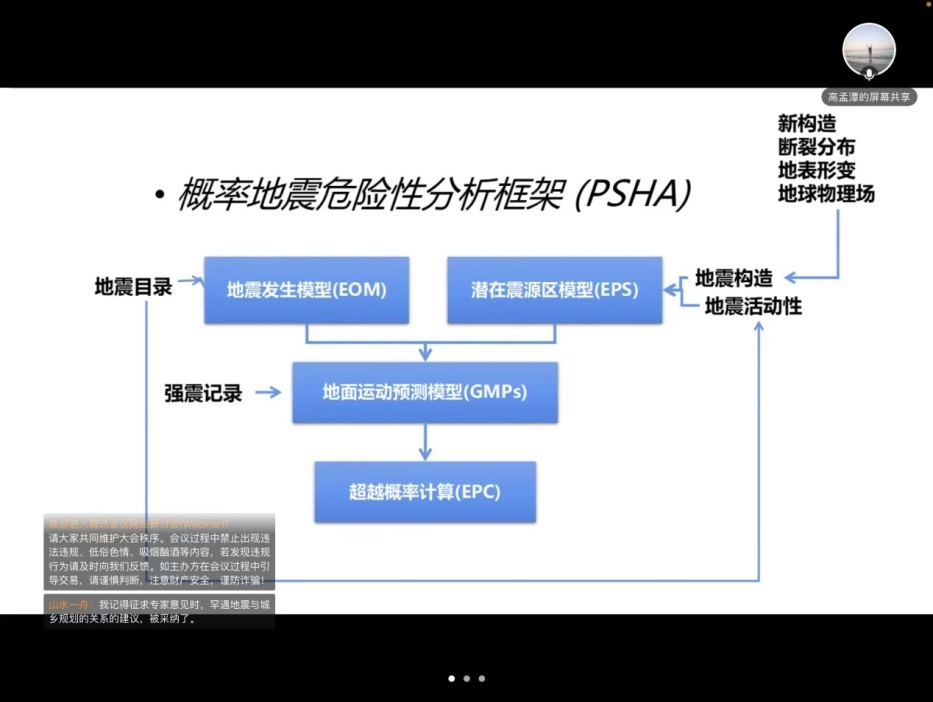 首先,高孟潭研究员对于中国地震区划图编制方法与应用进行了权威解读,内容包括地震区划基本概念、地震风险与地震危险性、中国地震区划历史沿革、中国第五代地震动参数区划图及其作用、基于概率的地震参数区划图编制原理与方法、中国第六代地震参数区划图展望等。其中,详细介绍了第五代区划图相对于前四代区划图的方法创新;针对概率地震危险性分析框架,详细介绍了地震潜在震源区划分、地震动活动性分析、地震动预测方程、超越概率计算等;针对六代地震区划图,从提高生命安全、社会经济风险防控、社会经济持续发展的角度,提出应将统计模型与物理模型相结合,形成多概率、多周期和高精度的地震动参数区划图集,并建立数字地震云服务,为风险评估提供地震模型,为需要计算承灾体组合的保险应用等提供地震事件集,全面满足抗震设防、风险评估等领域的等多样化应用。