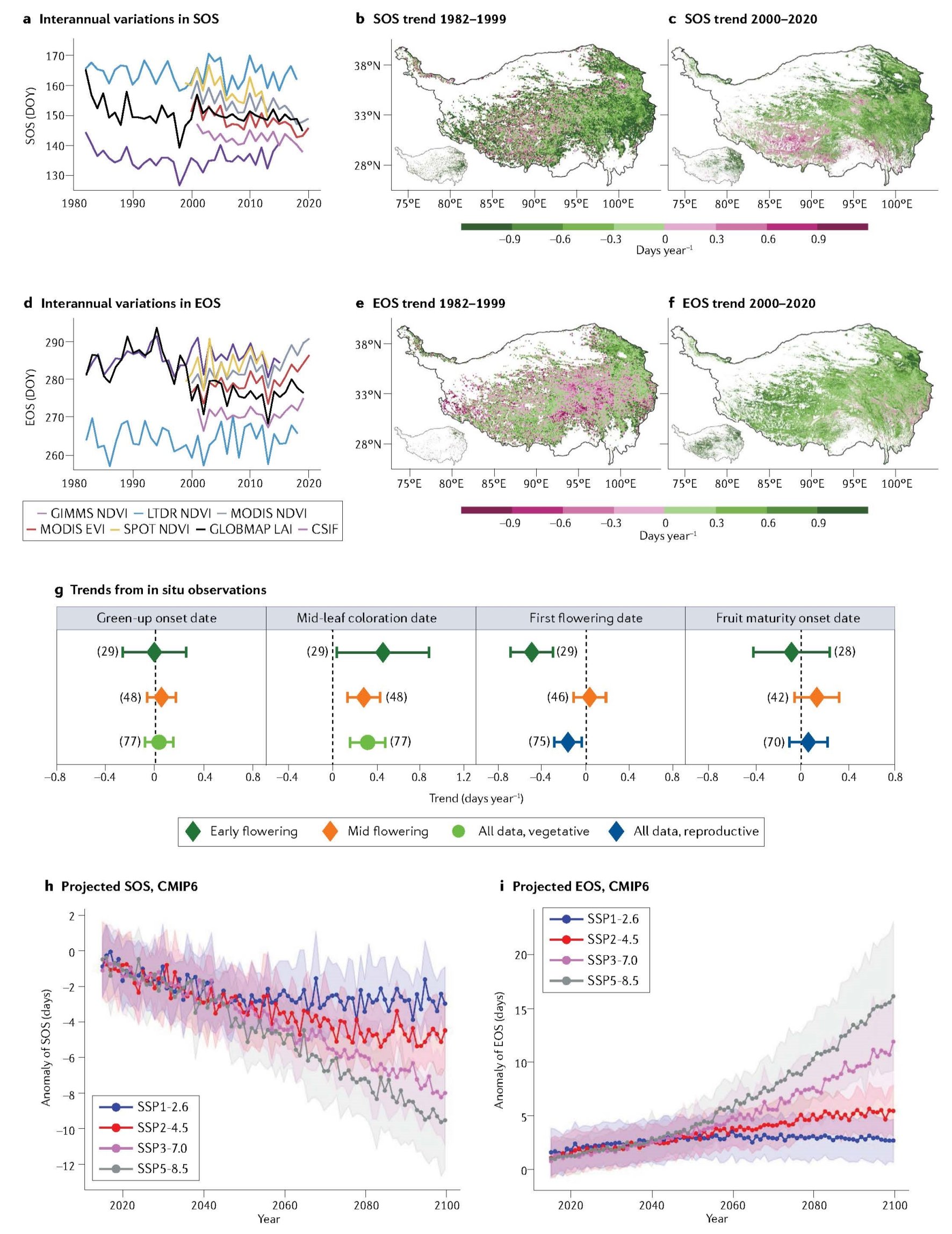 图1.青藏高原植物物候变化。(a和d)基于不同遥感数据计算的高原平均的生长季开始(SOS)和结束期(EOS)的年际波动;(b、c、e和f)SOS和EOS变化趋势的空间格局,负值表示提前,正值表示推迟;(g)基于地面观测的各物候期的整体变化趋势,括号中数字表示用于计算整体趋势的时间序列个数,深绿色和橙色分别表示早花物种和中花物种;(h和i)模型预估的未来不同气候变化情景下高原平均SOS和EOS变化(相较于2000-2014平均)。
