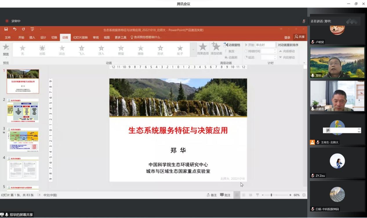 2022年10月18日上午,足球欧洲杯 自然资源足球欧洲杯资源科学前沿系列讲座第八期——“生态系统服务特征与决策应用”成功举办。本次讲座由于德永教授主持,邀请了中国科足球欧洲杯生态环境研究中心城市与区域生态国家重点实验室副主任、国家杰出青年科学基金项目获得者郑华研究员为主讲嘉宾,讲座以线上会议的形式进行,吸引了校内外三百余名业内专家及学生参加。