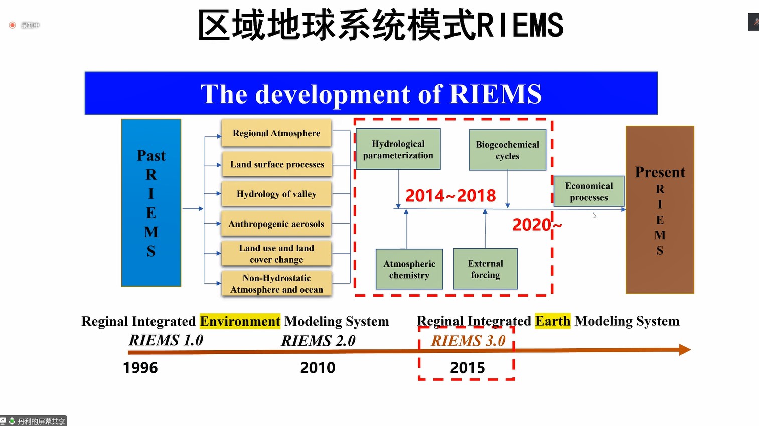 随后,丹利研究员重点介绍了区域地球系统模式研发与应用。全球地球系统模式分辨率粗,无法模拟小尺度过程,不适用于区域研究。团队构建了全球尺度、区域尺度、流域尺度、局地尺度的空间多尺度模拟系统,自主研发了区域气候环境集成系统模式(RIEMS)和植被大气相互作用模式(AVIM)。区域气候环境集成系统模式(RIEMS)在东亚区域模式比较计划(RMIP)中对东亚夏季雨带的位置与强度有较好的模拟,在国际大气化学模式比较计划(MICS-Asia)中对华北PM2.5浓度模拟最好,植被大气相互作用模式(AVIM)对碳通量和土壤碳库模拟性能突出。碳氮循环过程显著提升了对生物地球循环过程的模拟能力。