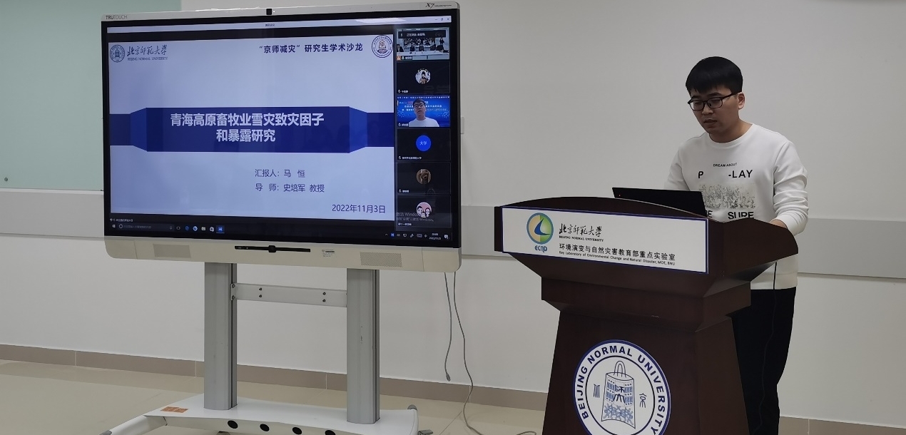 随后,2021级博士生刘苇航进行了“过度湿润对于中国玉米减产的差异性影响”的主题报告。他的研究通过建立过度湿润和作物减产间的关系,发现过度湿润对于中国玉米单产影响总体是负面的,在生育期末期负面影响最显著,且减产程度存在空间差异,最后从自然、人为因素解释空间分异的原因。2020级博士生马恒的报告题目为“青藏高原畜牧业雪灾致灾因子和暴露研究”。他从畜牧业雪灾研究进展综述、积雪深度和牧草高度的致灾因子危险性研究,以及青海高原畜牧业雪灾暴露研究三方面展开汇报,他的研究还首次形成了长时间序列的牲畜反演数据。