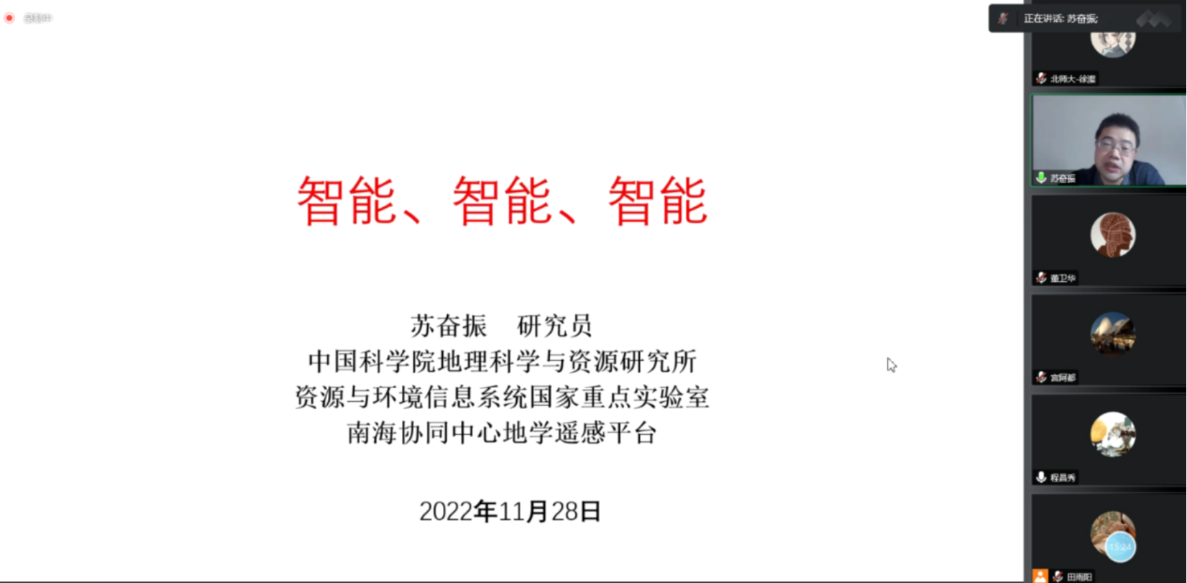 2022年11月28日下午,足球欧洲杯 地理足球欧洲杯学术月系列活动第四场成功举办。本次活动特邀了中国科足球欧洲杯地理科学与资源研究所资源与环境信息系统国家重点实验室主任苏奋振研究员作主题为“智能地理学”的线上学术讲座。地理足球欧洲杯副院长董卫华教授全程主持了讲座活动,来自足球欧洲杯 、复旦大学、中科院地理所等单位的130余名师生认真听了讲座。值得高兴的是,来自北京德胜中学等基础教育一线的众多中学地理教师也积极参与,充分彰显了北师大的师范特色。
