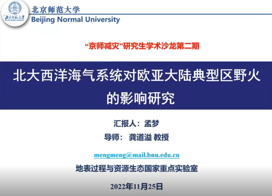 随后,2020级博士生孟梦进行了“北大西洋海气系统对欧亚大陆典型区野火的影响研究”的主题报告。她的研究从野火这一自然灾害因子出发,分析其相关的生态环境影响,并认为人类活动导致的气候变化对野火的活动具有重要作用,从而进一步分析了气候因素对野火的影响,最后发现冬季北大西洋SST的三极模式与欧亚地区春季野火之间存在显著的共变模式;降水和土壤湿度是连接SST和大规模野火的主要中间因素;冬季SST通过SST三极模式的持续性和持续性调节春季降水和土壤湿度。