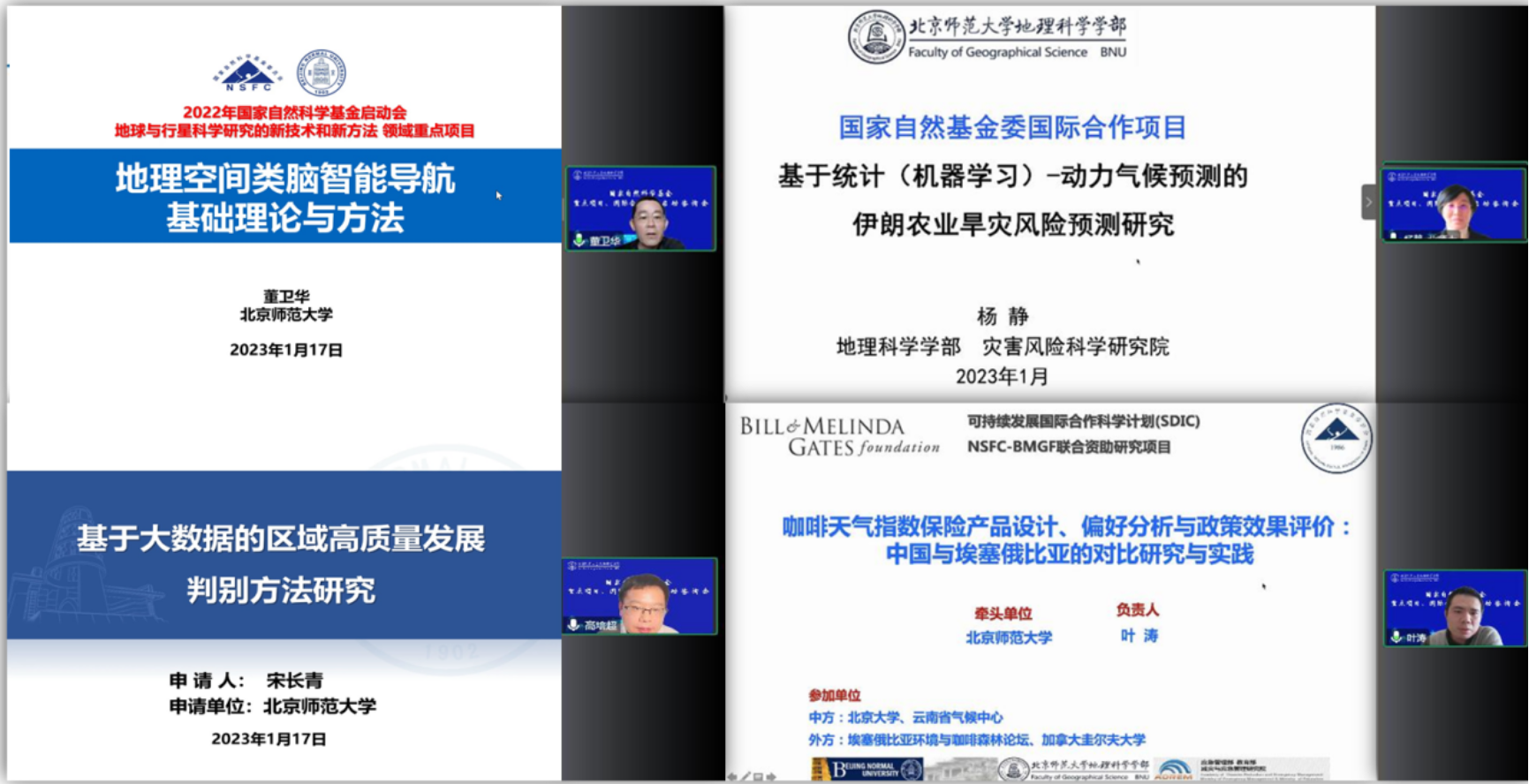 傅伯杰院士主持汇报环节和专家组指导环节,在傅院士的主持下,项目负责人董卫华教授、杨静教授、叶涛教授和研究骨干高培超讲师分别对国家自然科学基金重点项目“地理空间类脑智能导航基础理论与方法”,国家自然科学基金国际合作项目“基于统计(机器学习)-动力气候预测的伊朗农业旱灾风险季节预测研究”,国家自然科学基金国际合作项目“咖啡天气指数保险产品设计、偏好分析与政策效果评价:中国与埃塞俄比亚的对比研究与实践”和国家自然科学基金重点项目“基于大数据的区域高质量发展的判别方法研究”的研究背景与意义、研究内容与实施方案、项目特色与创新、项目预期成果与项目团队等方面进行了汇报。