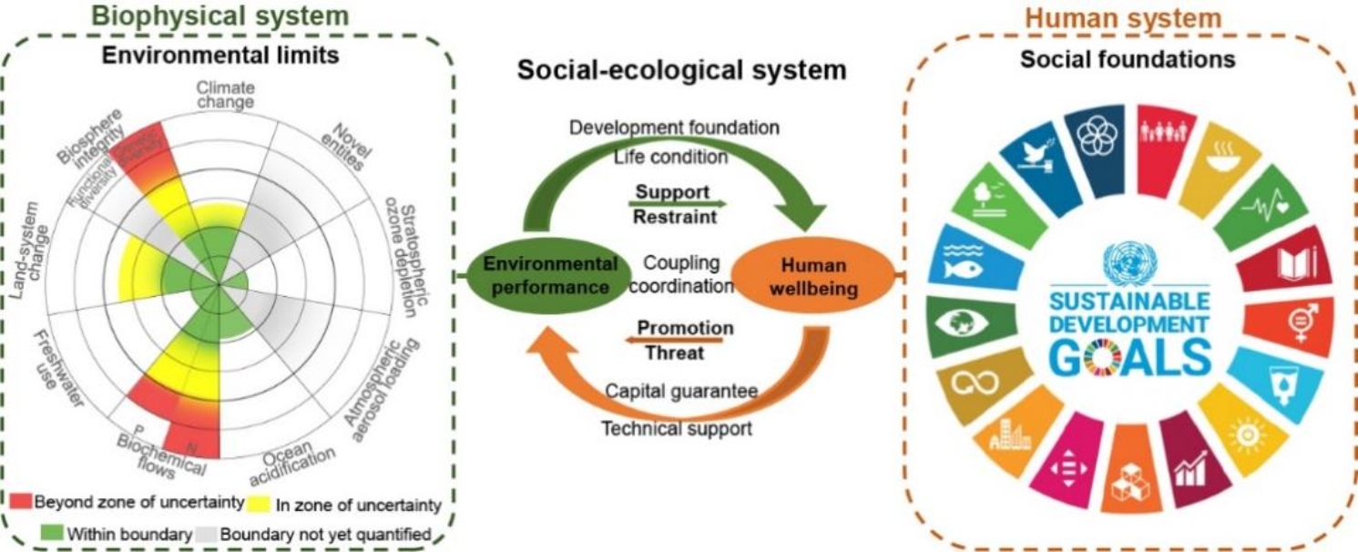 图1 SDGs视角下环境绩效与人类福祉之间的耦合关系评估框架。该框架整合了安全且公正的运行空间和地球系统界限约束下的环境足迹阈值/限额,从社会-生态系统耦合的视角度量与可持续发展目标相关的可持续性。人类福祉(社会基础)指标与可持续发展目标相对应,而这些目标的实现应受到以地球系统边界计量的环境足迹阈值/限额的约束。这两个子系统不是孤立的,它们之间存在复杂的耦合作用。