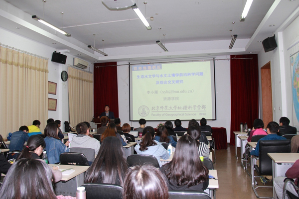 李小雁教授作了题为《生态水文学与水文土壤学前沿科学问题及综合交叉研究》的学术报告。报告首先介绍了生态水文学和水文土壤学研究的国际态势、关键问题及二者的交叉集成研究等方面的国内外最新研究进展,并向与会师生展示了资源足球欧洲杯生态水文研究团队有关黑河重大研究计划、青海湖流域关键带研究、太仆寺旗野外观测研究等最新研究成果。同时,李小雁教授还借此机会,向大家介绍了资源足球欧洲杯的研究团队及其研究方向和特色。