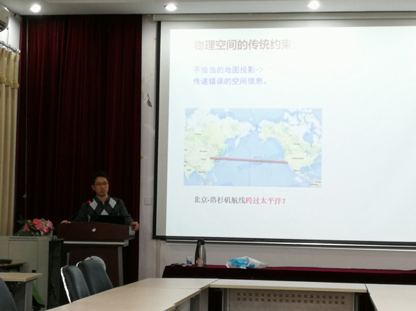 应申教授作题为《论ICT时代的地图学》学术报告。报告首先对传统地图学与ICT时代背景下的地图学做了多方位的对比,并从传统物理空间的制约及新型ICT数据的特性出发,指出了在互联网信息通信技术的高度发展对地图学带来的冲击与机遇。接下来,应教授从二维、三维地图、VR、AR、MR仿真场景等方面,分别解读了地图学崭新的发展趋势与应用前景。应教授明确指出了地图学与现代IT技术互相适应的本质特征,同时强调了新地图学应生成更加易读、易获取的地图,并应跳出传统技术和理论的限制,整合技术与艺术,突出表达方式,从专业、政府应用到公众全民的普适,以实现地图学的复兴。