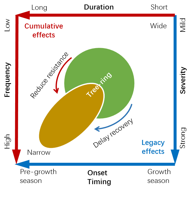 地理学部减灾与应急管理研究院博士生高姗与指导教师周涛教授等近日在Global Change Biology (IF= 8.997)发表研究论文,综合应用北美西南部大量的树轮数据,借鉴社会科学中对复杂问题分析的经典研究方法“自然试验”(natural experiment),通过设计区域尺度上的试验,研究了树木年轮对干旱过程的动态响应,揭示了一些新的规律,并提出了相应的概念框架。研究指出,年内干旱频率与持续时间的增加将产生累积效应(cumulative effects),这将使树木对干旱的抵抗力降低,从而受到更大的损害。此外,生长前期的干旱遗产对树木的影响要远大于生长期的干旱,干旱强度的增加也使遗产效应(legacy effects)增强。这些结果清楚呈现出以往静态统计模型难以准确预测树木对干旱响应的重要原因,同时也给后续研究提供了参考方向。
