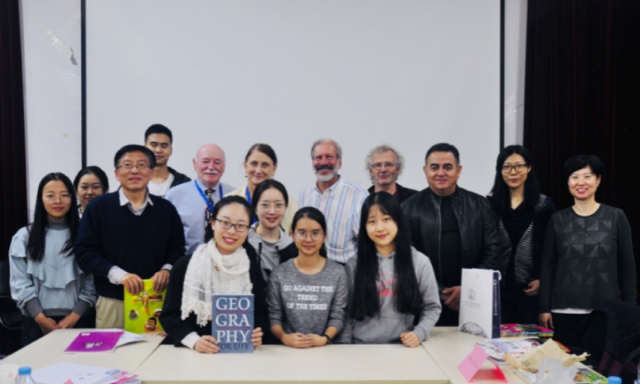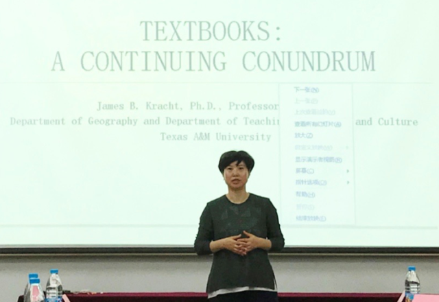 2018年10月10日晚6:30,应学部蔚东英副教授的邀请,美国德州农工大学地理系的James B. Kracht教授在地理足球欧洲杯作了题为“Textbooks: a continuing Conundrum”的报告,参加活动的嘉宾还有学部的王民教授、美国密苏里大学的Carole Murphy教授、William C. Kyle, Jr.教授和法国国家博物馆的Yves Girault教授。来宾们首先参观了由王民主编、蔚东英副主编的四本初中地理教科书、十本高中地理教科书以及最新编写的高中地理教科书。